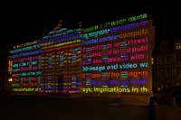 Projection Artist Ross Ashton, projected onto 2 sites, Senate House and the adjacent Old School, and the end of Kings College Chapel and the next door Gibbs Building. A combination of PIGI and video projection technologies supplied by E/T/C London were utilised in three separate but related animated shows. These expressed elements of the University's dynamic science and research programmes as art in breath-taking large format scrolling images.