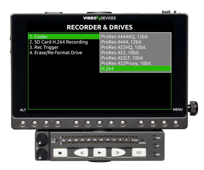 With the addition of H.264, an applied LUT is baked into the H.264 .mp4 file and saved via SD card. The master ProRes 4K file is saved to the Video Devices' SpeedDrive without an applied LUT. This is suited for users wanting to simultaneously record a full dynamic range, log-encoded ProRes master file for the edit suite and a REC709 H.264 file suitable for client viewing.